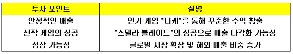시프트업의 주요 투자 포인트는 다음과 같습니다.